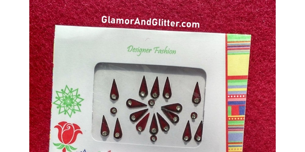 Glamorous jeweled bindis in a dark maroon felt background with black outlines. With premium faceted clear crystals.