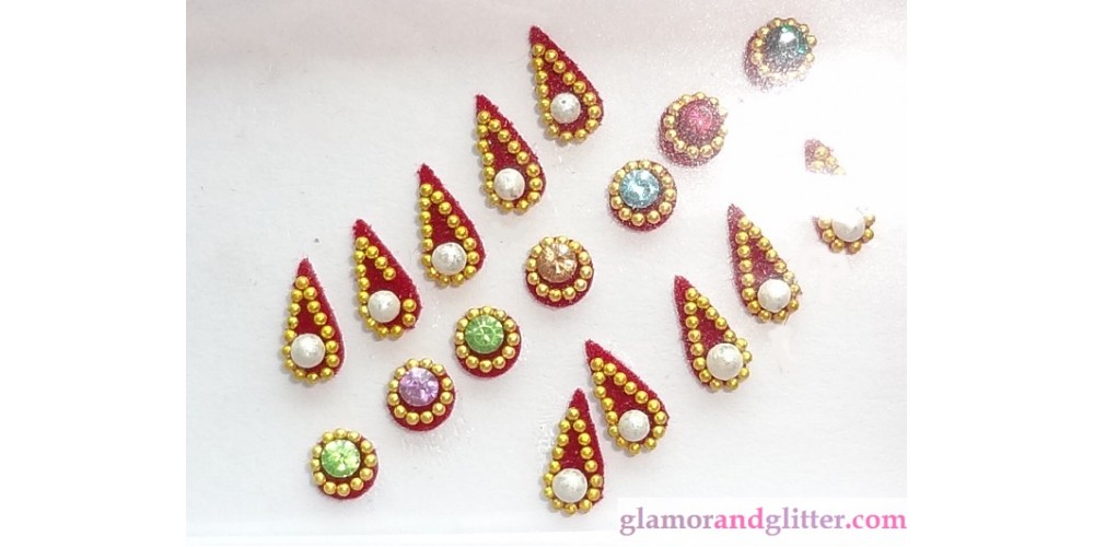 Tags: jewelled bindis, maroon crystal bindis, gold jewel bindis