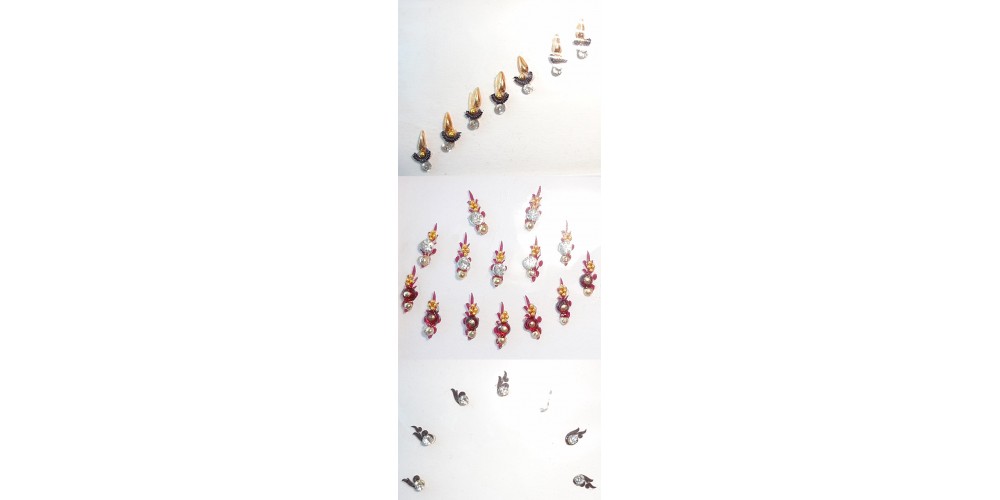Beautiful glittering bindis in different shapes and colors. The bindis are on a felt base and are lavishly studded with glittering premium faceted crystals and "jewels". You get all 3 sets shown above - a total of 28 bindis.  The bindis you get will be the same or similar to those depicted