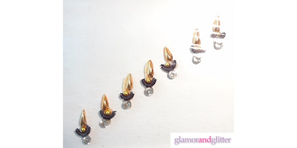Bindi Set 1 has a felt base with flame like gold jewels, black wired beads and clear white crystals on the base.