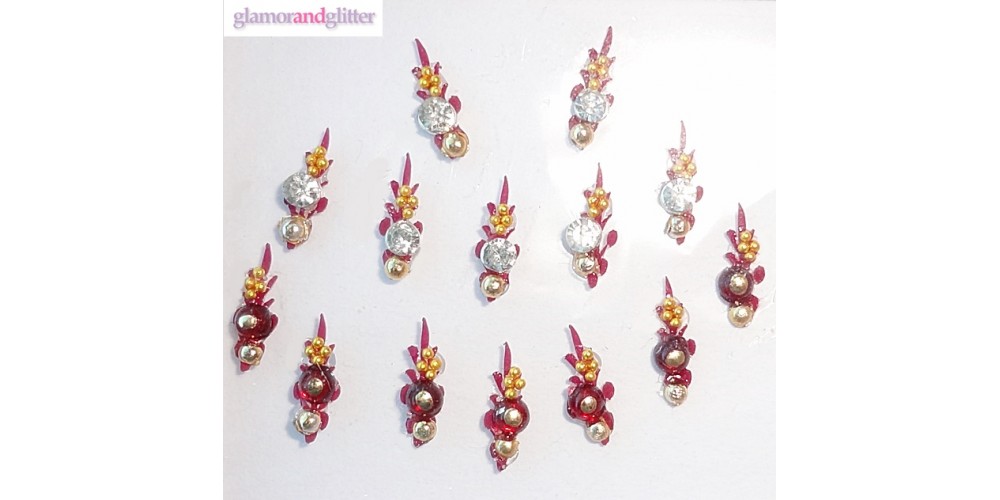 Bindi Set 2 has a dark maroon felt base with embellished with faceted white crystals, maroon stones, and gold beads.