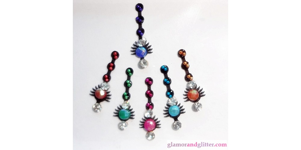 Long black velvet bindis encrusted with multiple crystals. These designer bindis have sparkling colored crystals bracketed with premium white faceted crystals. Tiny balls add a touch of color. This pack contains 6 bindis.