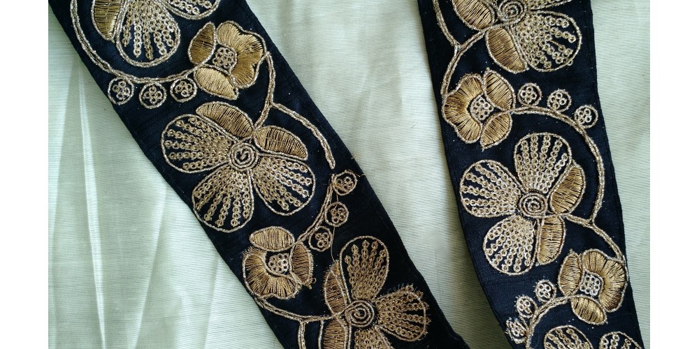 Tags: black velvet trim, metallic gold trim, gold sequins, hand embroidered trim, sequins trim, hand embroidery