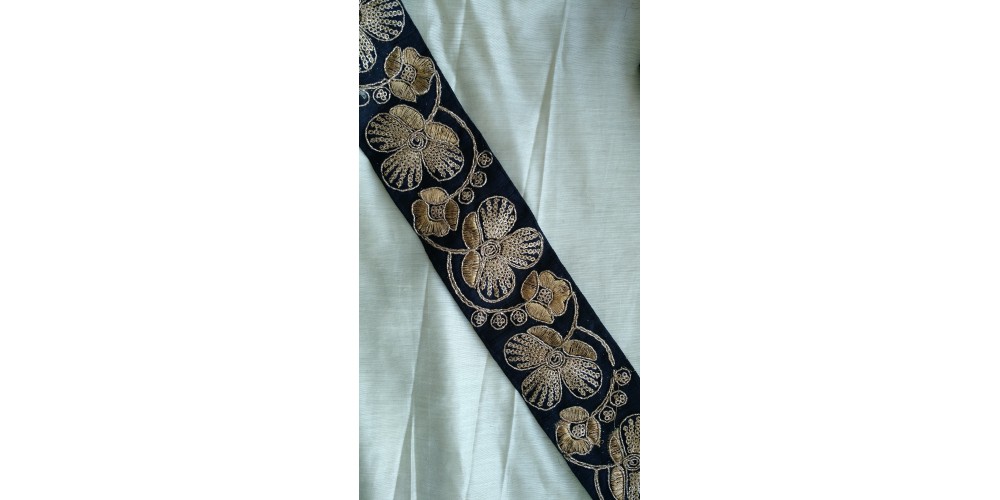 A stunning trim with hand embroidered floral designs in the zardozi style. Zardozi embroidery had its origins in Persia and refers to embroidery in gold thread. The base of this luxurious trim is black rayon.  Width is approx. 2 3/8 inch (60mm).