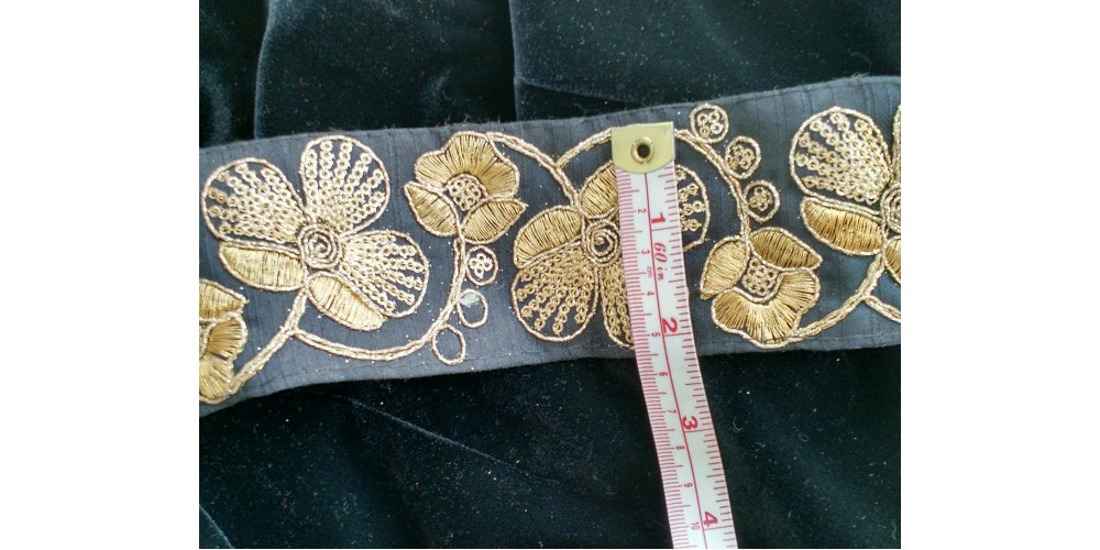 Hand Embroidered 2 1/8" Black Gold Velvet Trim Lace Ribbon Sari Border Sequins Military Vestment Renaissance Costumes Sewing VT104