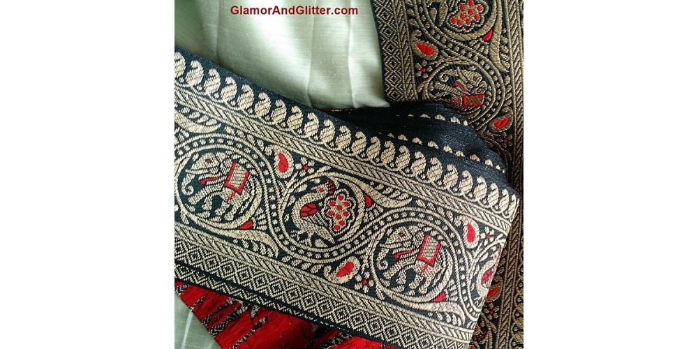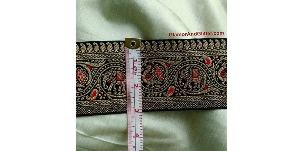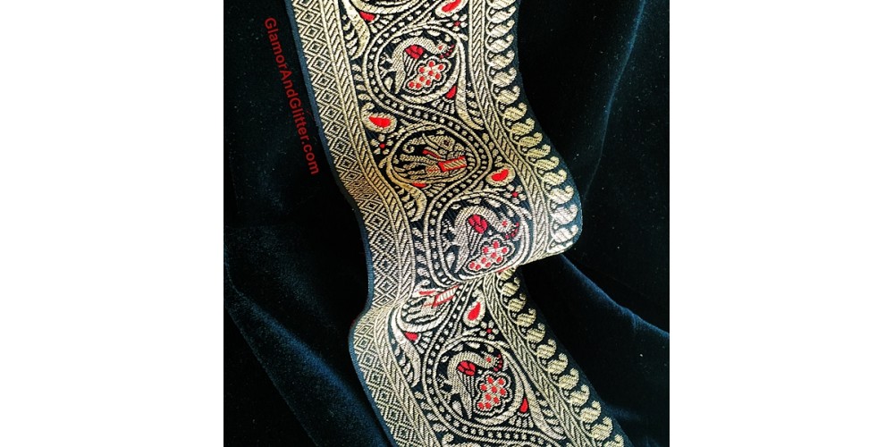 Extra wide richly embroidered Brocade Jacquard Trim on a black background. This embroidered jacquard trim is extra wide at 2 7/8 inches (74mm). Price is per yard. The material is a rayon & cotton blend. The background is black. A pattern of elephants, peacocks, paisleys, flowers and scrolls is richly embroidered in antique gold and red. The edges have diamonds on one side and paisleys on the other.