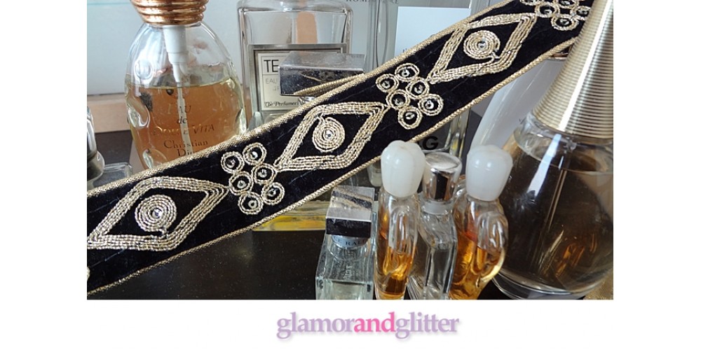 A beautiful trim with hand embroidered geometric designs of diamonds and circles. Soft black velvet is the base of this luxurious trim. The trim is edged in Gold cloth and embellished with sequins. Width is approx. 1 3/8 inch (37mm).