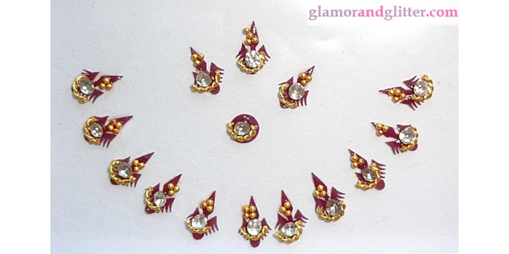 15 dark burgundy bindis. Embellished with glittering premium white crystals and tiny gold beads and braided jewels.