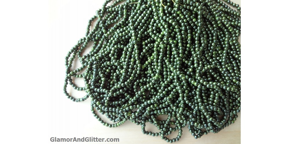 Approximately 5487 seed beads. These lustrous forest green beads are 2mm in diameter and round in shape. The hole in each bead is approx 1mm.