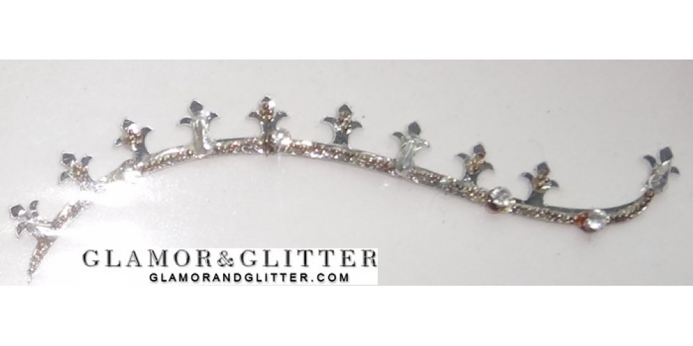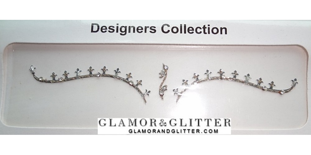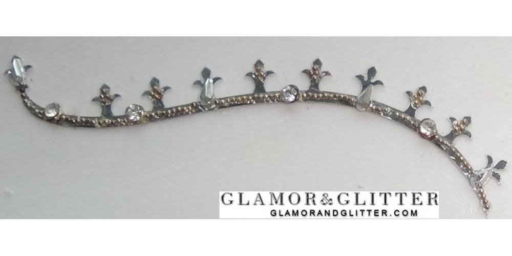 Encrusted with white crystals and silver jewels - this set of bindis is made of metallic silver. Please note all references to silver or gold apply to color only - these are not actually silver or gold.