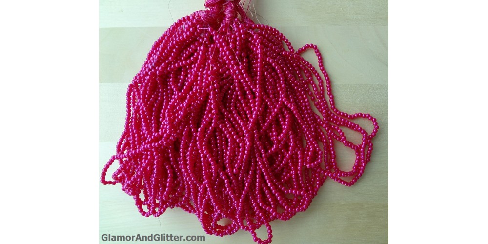 Approximately 6180 lustrous round seed beads. These pretty magenta pink beads are 2mm in diameter and round in shape. The hole in each bead is approx 1mm. The beads come stringed on a strong pink thread for your convenience.  There are about 103 beads on each strand and a total of 60 strands of beads.