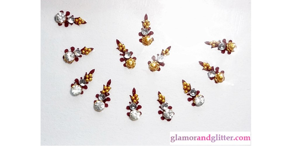 Tags: jewelled bindis, maroon crystal bindis, gold jewel bindis