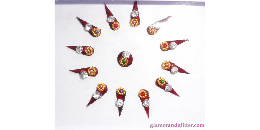 Tags: jewelled bindis, maroon crystal bindis, gold jewel bindis