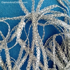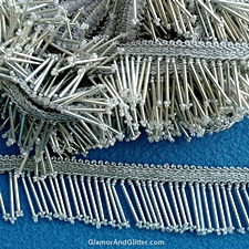 Silver beaded fringe trim that is both elegant and playful. 1 3/8" (38 mm) in width, the fringe in this sparkling trim is double the usual density.