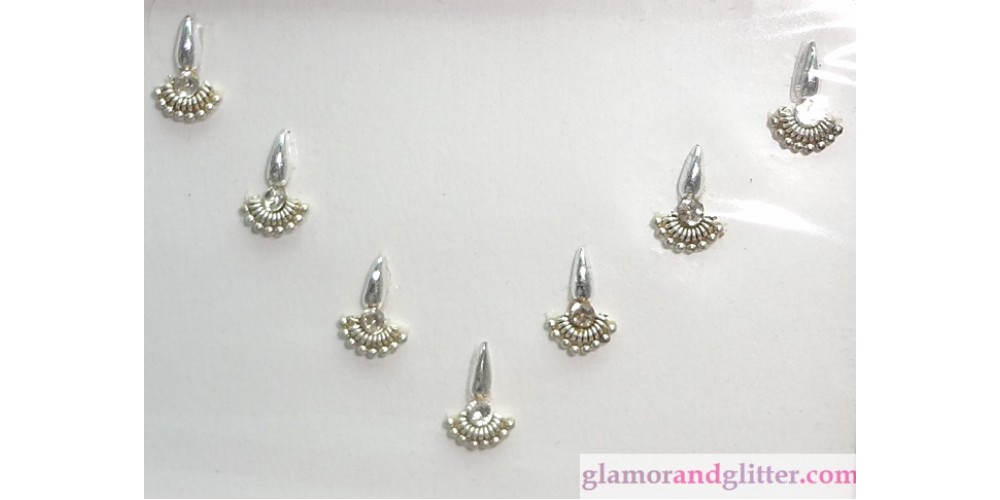 These exquisite silver jewelled bindis are styled to emulate jewelry. They are metallic silver with a slightly antique silver tone embellished with white crystals. Each pack contains 7 bindis. They can be worn not only as bindis but also as ear studs and nose studs